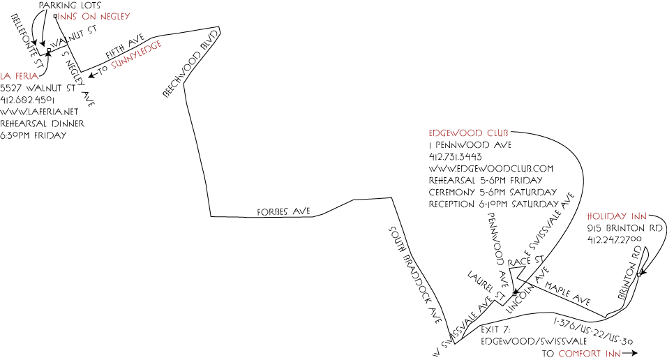 These are things going on the weekend of the wedding. We'll fill in details as we know them. If you don't see anything on the schedule for yourself, look in the left column for ideas of things to do with your free time! The map below shows where the significant events will take place as well as the lodgings that are closest to them. (Yes, there are more direct routes between Regent Square and Edgewood to the southeast and Shadyside to the northwest, but we've routed you around traffic and congested intersections. Trust us!)